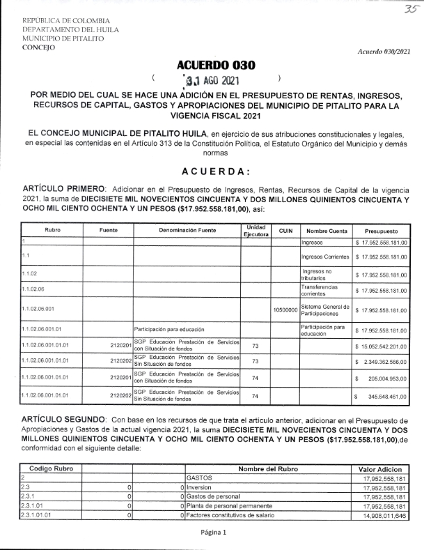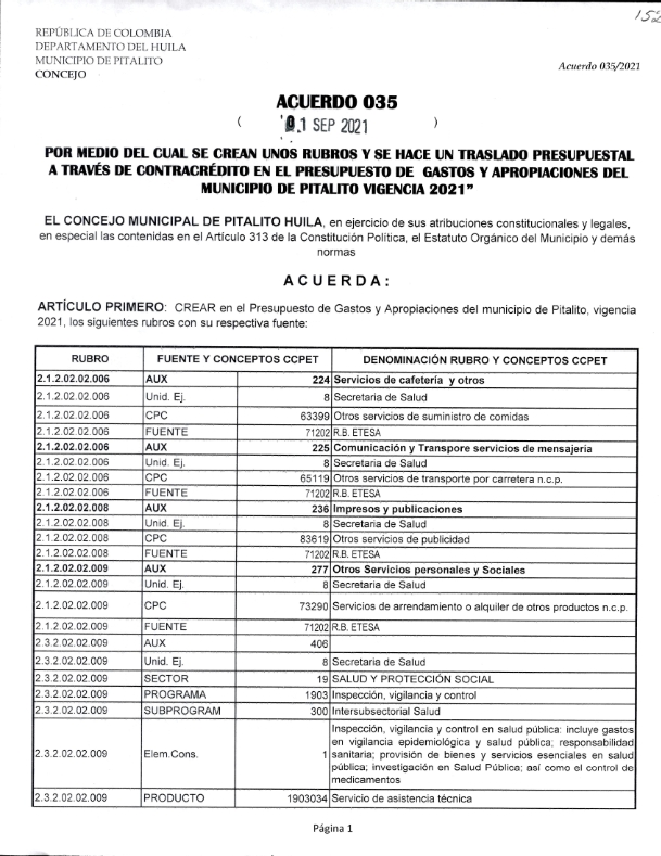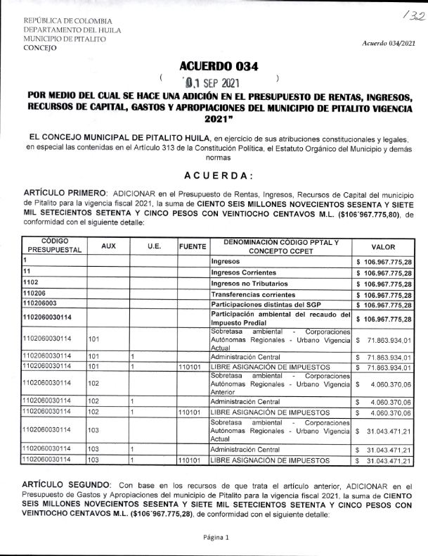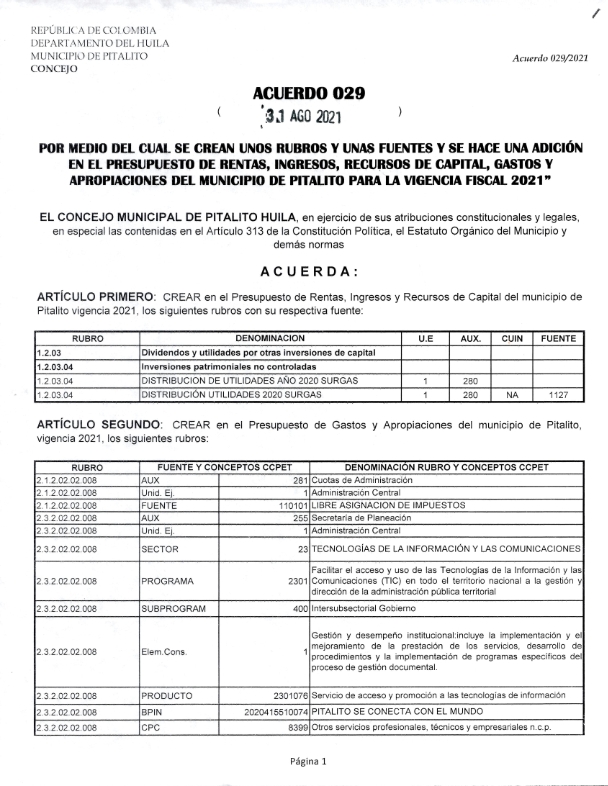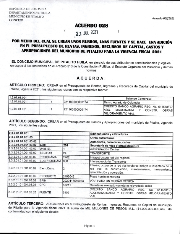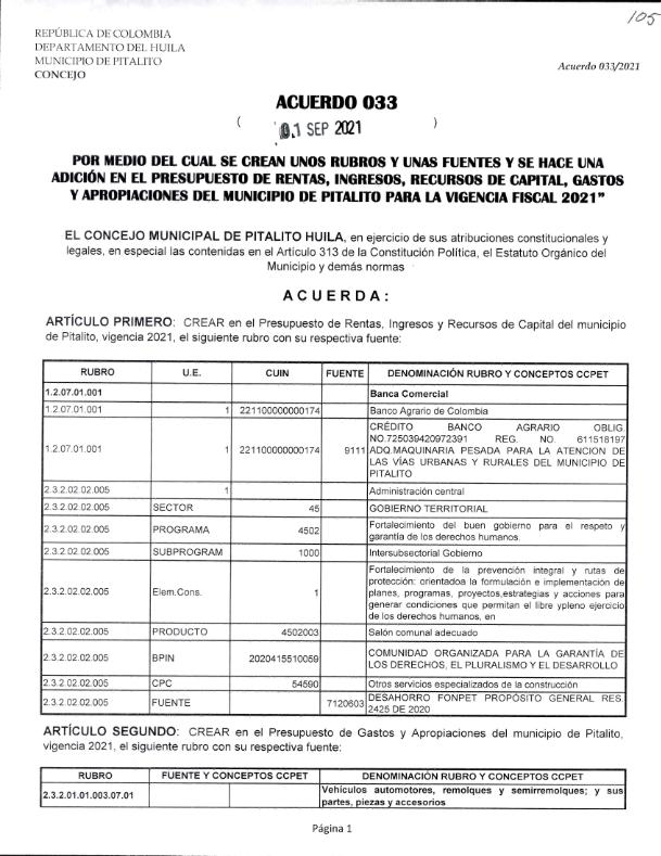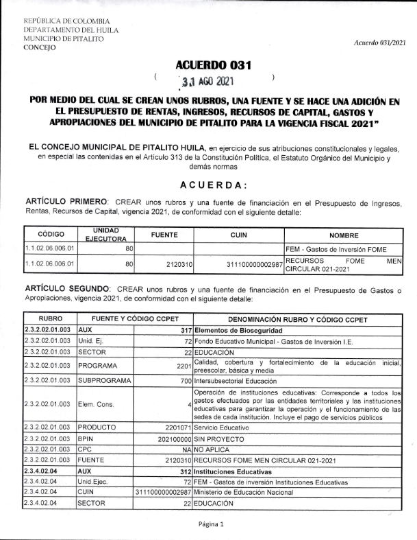Acuerdo 033 – 2021 Julián Chávez Trujillo septiembre 1, 2021 ACUERDO 033 «POR MEDIO DEL CUAL SE CREAN UNOS RUBROS Y UNAS FUENTES Y SE HACE UNA ADICION EN EL […]