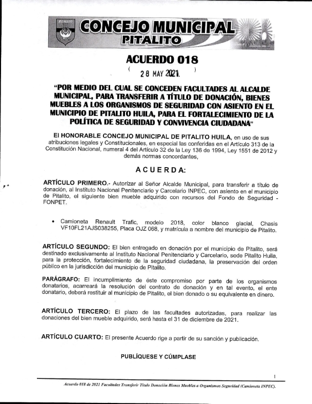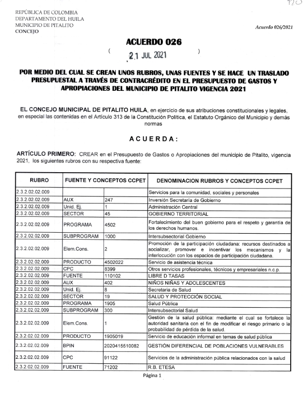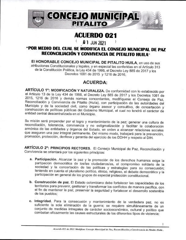 Acuerdo 021 – 2021 Julián Chávez Trujillo julio 1, 2021 ACUERDO 021 «POR MEDIO DEL CUAL SE MODIFICA EL CONSEJO MUNICIPAL DE PAZ RECONCILIACION Y CONVIVENCIA DE PITALITO HUILA» Descargar […]