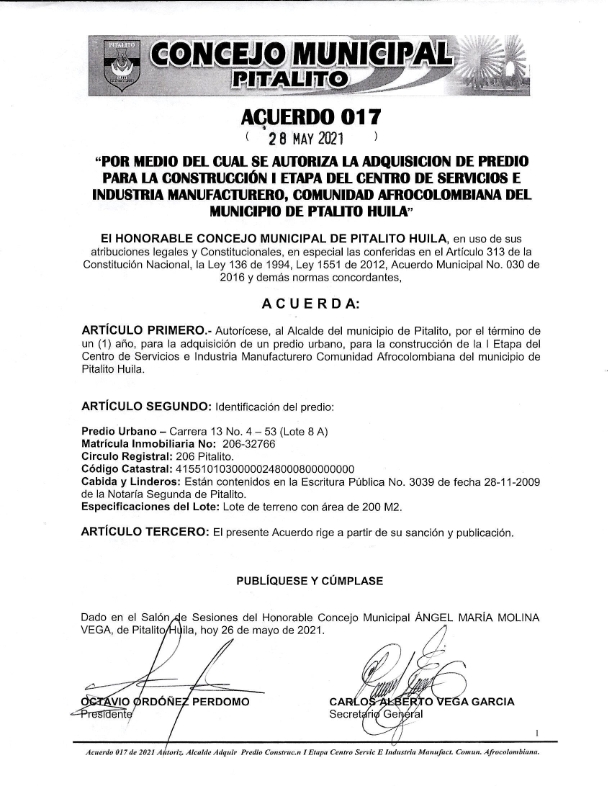 Acuerdo 017 – 2021 Julián Chávez Trujillo mayo 28, 2021 ACUERDO 017 «POR MEDIO DEL CUAL SE AUTORIZA LA ADQUISICION DE PREDIO PARA LA CONSTRUCCION I ETAPA DEL CENTRO DE […]