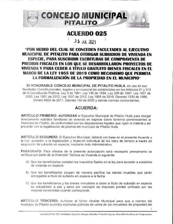 Acuerdo 025 – 2021 Julián Chávez Trujillo julio 15, 2021 ACUERDO 025 «POR MEDIO DEL CUAL SE CONCEDEN FACULTADES AL EJECUTIVO MUNICIPAL DE PITALITO PARA OTORGAR SUBSIDIOS DE VIVIENDA EN […]