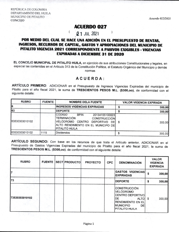 Acuerdo 024 – 2021 Julián Chávez Trujillo julio 5, 2021 ACUERDO 024 «POR MEDIO DEL CUAL SE CREAN UNOS RUBROS Y UNAS FUENTES Y SE HACE UNA ADICION EN EL […]